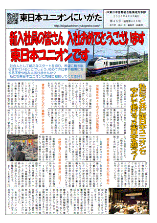 ★ 2026年 4月 6日 「学習・資料コーナー」に、最近の話題コーナーの記事を掲載しました ★ 2026年 4月 5日 「地本情報紙コーナー」に、機関紙「東日本ユニオンにいがた」第45号を掲載しました ★ 2026年 4月 4日 「賃金引き上げのたたかい2026コーナー」に「情勢を知ろうのコーナー」の記事を掲載しました ★ 2026年 4月 3日 「学習・資料コーナー」に、最近の話題コーナーの記事を掲載しました ★ 2026年 4月 2日 「賃金引き上げのたたかい2026コーナー」に「本部団体交渉のコーナー」の記事を掲載しました ★ 2026年 4月 1日 「地本情報紙コーナー」に、機関紙「東日本ユニオンにいがた」第44号を掲載しました ★ 2026年 3月31日 「地本団体交渉コーナー」に、申12号・支社側の回答及び見解を掲載しました ★ 2026年 3月30日 「学習・資料コーナー」に、最近の話題コーナーの記事を掲載しました ★ 2026年 3月29日 「地本団体交渉コーナー」に、申5号・団体交渉のポイントを掲載しました ★ 2026年 3月28日 「賃金引き上げのたたかい2026コーナー」に「情勢を知ろうのコーナー」の記事を掲載しました ★ 2026年 3月27日 「学習・資料コーナー」に、最近の話題コーナーの記事を掲載しました ★ 2026年 3月26日 「地本情報紙コーナー」に、情報紙「unify」第45~51号を掲載しました ★ 2026年 3月26日 「組合員へのお知らせコーナー」に「こくみん共済COOP更新・新規契約のお知らせ」を掲載しました ★ 2026年 3月25日 「地本情報紙コーナー」に、機関紙「東日本ユニオンにいがた」第43号を掲載しました ★ 2026年 3月24日 「地本団体交渉コーナー」に、申8号・支社側の回答及び見解を掲載しました ★ 2026年 3月24日 「地本情報紙コーナー」に、情報紙「unify」第44号を掲載しました |