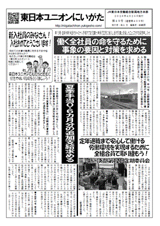 ★ 2026年 4月26日 「地本団体交渉コーナー」に、申14号・17号・団交日程決定を掲載しました ★ 2026年 4月25日 「地本情報紙コーナー」に、機関紙「東日本ユニオンにいがた」第49号を掲載しました ★ 2026年 4月25日 「地本団体交渉コーナー」に、申17号・申し入れ提出を掲載しました ★ 2026年 4月24日 「地本団体交渉コーナー」に、提案団体交渉終了を掲載しました ★ 2026年 4月24日 「地本情報紙コーナー」に、情報紙「unify」第53号を掲載しました ★ 2026年 4月23日 「支部・分会の取り組みコーナー」に、新津地区分会の取り組みを掲載しました ★ 2026年 4月22日 「地本団体交渉コーナー」に、申16号・申し入れ提出を掲載しました ★ 2026年 4月21日 「新潟地本 活動のあゆみコーナー」に、申8号団体交渉を掲載しました ★ 2026年 4月21日 「地本情報紙コーナー」に、情報紙「unify」第52号を掲載しました ★ 2026年 4月20日 「地本情報紙コーナー」に、機関紙「東日本ユニオンにいがた」第48号を掲載しました ★ 2026年 4月20日 「学習・資料コーナー」に、最近の話題コーナーの記事を掲載しました ★ 2026年 4月19日 「地本団体交渉コーナー」に、2024年度申16号・団体交渉のポイントを掲載しました ★ 2026年 4月18日 「賃金引き上げのたたかい2026コーナー」に「情勢を知ろうのコーナー」の記事を掲載しました ★ 2026年 4月17日 「学習・資料コーナー」に、最近の話題コーナーの記事を掲載しました ★ 2026年 4月16日 「賃金引き上げのたたかい2026コーナー」に「本部団体交渉のコーナー」の記事を掲載しました ★ 2026年 4月15日 「地本情報紙コーナー」に、機関紙「東日本ユニオンにいがた」第47号を掲載しました ★ 2026年 4月14日 「新潟地本 活動のあゆみコーナー」に、第6回組織業務担当者会議を掲載しました ★ 2026年 4月13日 「学習・資料コーナー」に、最近の話題コーナーの記事を掲載しました |