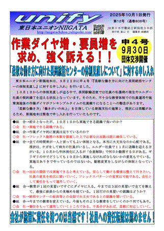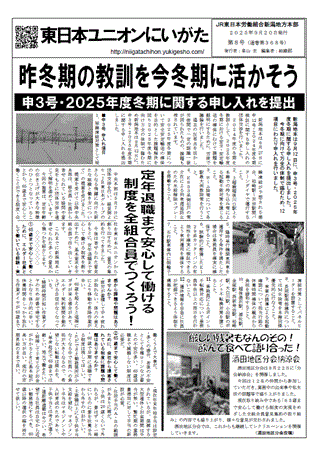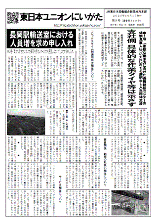 ★第 12号 2025年10月 1日 作業ダイヤ増・要員増を求め、強く訴える!!~申4号交渉開催~ ★第 11号 2025年 9月30日 「社員の責任を問うものではない」ことを確認!~申2号交渉速報~ ★第 10号 2025年 9月23日 フレキシブルタイム頼りの作業ダイヤで良いのか?~申4号申し入れ~ ★第 9号 2025年 9月19日 みんなで基本要求をつくろう!!~定年退職まで安心して働ける制度を実現しよう~ ★第 8号 2025年 9月17日 申3号 2025年度冬期に関する申し入れ 提出 ★第 7号 2025年 9月13日 申2号「社員に責任を負わせるプレス発表に対する緊急申し入れ」を提出!! ★第 6号 2025年 9月 8日 団体交渉開催決定!!申1号「柔軟な働き方に向けた長岡統括センターの体制見直しについて」に対する解明申し入れ ★第 5号 2025年 8月26日 ウソをついたのは誰なのか?賃金未払いを許さない!!シリーズ⑤ ★第 4号 2025年 8月26日 65歳まで安心して働ける会社をつくるぞ! ★第 3号 2025年 8月25日 団体交渉開催決定!! 申15号 ★第 2号 2025年 8月15日 65歳まで安心して働ける制度の実現をめざそう! ★第 1号 2025年 8月 1日 東日本ユニオンを強化・拡大しよう!~新潟地本第14回定期大会~ |