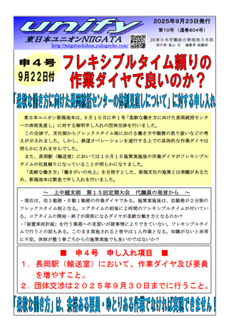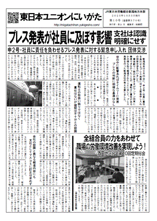 ★ 第11号 2025年10月10日 支社側「必要な出面は確保」強調~申4号団体交渉で要員増を訴える~ ほか ★ 第10号 2025年10月 5日 プレス発表が社員に及ぼす影響 支社は認識明確にせず~申2号団体交渉~ ほか ★ 第 9号 2025年10月 1日 支社側 具体的な作業ダイヤ等は示さず~申1号団体交渉~ ほか ★ 第 8号 2025年 9月20日 昨冬期の教訓を今冬期に活かそう~申3号申し入れ提出~ ほか ★ 第 7号 2025年 9月15日 安全・サービス・働きがいの観点から検証~申14号団体交渉~ ほか ★ 第 6号 2025年 9月10日 プレス発表を行った目的を質す~申2号 社員に責任を負わせるプレス発表に対する緊急申し入れ~ ほか ★ 第 5号 2025年 9月 1日 フレックスタイム制拡大に対し目的や詳細の解明に向け申入れ~申1号申入れ~ ほか ★ 第 4号 2025年 8月20日 次期ダイヤ改正に「職場の声」反映を~申16号申入れ~ ほか ★ 第 3号 2025年 8月10日 行先変更時の系統番号入力 より確実・安全な取扱いを求める~申15号申入れ~ ★ 第 2号 2025年 8月 5日 「新しい会社組織」と「新しい人事・賃金制度」に向き合い東日本ユニオンとJR労働者の明るい未来を創造しよう! ★ 第 1号 2025年 8月 1日 長岡統括センターでフレックスタイム制を拡大~提案団体交渉~ ほか |