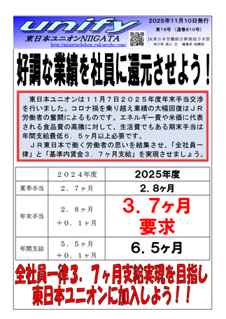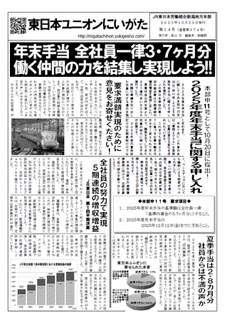 ★第 16号 2025年11月10日 好調な業績を社員に還元させよう! ★第 15号 2025年11月 6日 申6号 キハ110系及びGV―E400系の系統番号設定に関する申し入れ ★第 14号 2025年11月 3日 申5号 新潟駅手歯止め作業における適正な労働時間を求める申し入れ ★第 13号 2025年11月 3日 「全社員一律」「3.7ヶ月支給」に向けJR労働者の思いを結集させ実現しよう ★第 12号 2025年10月 1日 作業ダイヤ増・要員増を求め、強く訴える!!~申4号交渉開催~ ★第 11号 2025年 9月30日 「社員の責任を問うものではない」ことを確認!~申2号交渉速報~ ★第 10号 2025年 9月23日 フレキシブルタイム頼りの作業ダイヤで良いのか?~申4号申し入れ~ ★第 9号 2025年 9月19日 みんなで基本要求をつくろう!!~定年退職まで安心して働ける制度を実現しよう~ ★第 8号 2025年 9月17日 申3号 2025年度冬期に関する申し入れ 提出 ★第 7号 2025年 9月13日 申2号「社員に責任を負わせるプレス発表に対する緊急申し入れ」を提出!! ★第 6号 2025年 9月 8日 団体交渉開催決定!!申1号「柔軟な働き方に向けた長岡統括センターの体制見直しについて」に対する解明申し入れ ★第 5号 2025年 8月26日 ウソをついたのは誰なのか?賃金未払いを許さない!!シリーズ⑤ ★第 4号 2025年 8月26日 65歳まで安心して働ける会社をつくるぞ! ★第 3号 2025年 8月25日 団体交渉開催決定!! 申15号 ★第 2号 2025年 8月15日 65歳まで安心して働ける制度の実現をめざそう! ★第 1号 2025年 8月 1日 東日本ユニオンを強化・拡大しよう!~新潟地本第14回定期大会~ |