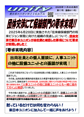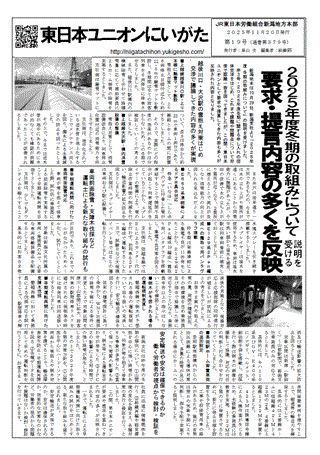 ★第 17号 2025年11月20日 団体交渉にて保線部門の要求実現!! ★第 16号 2025年11月10日 好調な業績を社員に還元させよう! ★第 15号 2025年11月 6日 申6号 キハ110系及びGV―E400系の系統番号設定に関する申し入れ ★第 14号 2025年11月 3日 申5号 新潟駅手歯止め作業における適正な労働時間を求める申し入れ ★第 13号 2025年11月 3日 「全社員一律」「3.7ヶ月支給」に向けJR労働者の思いを結集させ実現しよう ★第 12号 2025年10月 1日 作業ダイヤ増・要員増を求め、強く訴える!!~申4号交渉開催~ ★第 11号 2025年 9月30日 「社員の責任を問うものではない」ことを確認!~申2号交渉速報~ ★第 10号 2025年 9月23日 フレキシブルタイム頼りの作業ダイヤで良いのか?~申4号申し入れ~ ★第 9号 2025年 9月19日 みんなで基本要求をつくろう!!~定年退職まで安心して働ける制度を実現しよう~ ★第 8号 2025年 9月17日 申3号 2025年度冬期に関する申し入れ 提出 ★第 7号 2025年 9月13日 申2号「社員に責任を負わせるプレス発表に対する緊急申し入れ」を提出!! ★第 6号 2025年 9月 8日 団体交渉開催決定!!申1号「柔軟な働き方に向けた長岡統括センターの体制見直しについて」に対する解明申し入れ ★第 5号 2025年 8月26日 ウソをついたのは誰なのか?賃金未払いを許さない!!シリーズ⑤ ★第 4号 2025年 8月26日 65歳まで安心して働ける会社をつくるぞ! ★第 3号 2025年 8月25日 団体交渉開催決定!! 申15号 ★第 2号 2025年 8月15日 65歳まで安心して働ける制度の実現をめざそう! ★第 1号 2025年 8月 1日 東日本ユニオンを強化・拡大しよう!~新潟地本第14回定期大会~ |