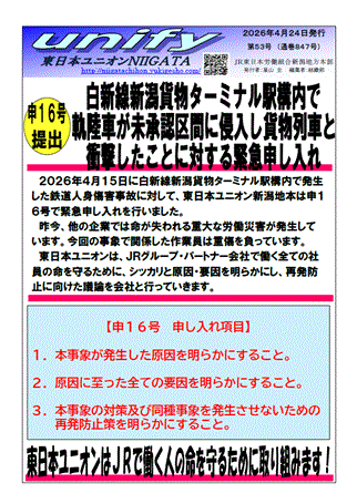 申16号 白新線新潟貨物ターミナル駅構内で軌陸車が未承認区間に侵入し貨物列車と衝撃したことに対する緊急申し入れ