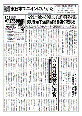 ★ 2026年 3月 9日 「地本情報紙コーナー」に、情報紙「unify」第41~43号を掲載しました ★ 2026年 3月 9日 「学習・資料コーナー」に、最近の話題コーナーの記事を掲載しました ★ 2026年 3月 8日 「地本団体交渉コーナー」に、申13号・団体交渉修了を掲載しました ★ 2026年 3月 7日 「賃金引き上げのたたかい2026コーナー」に「情勢を知ろうのコーナー」の記事を掲載しました ★ 2026年 3月 6日 「学習・資料コーナー」に、最近の話題コーナーの記事を掲載しました ★ 2026年 3月 5日 「地本団体交渉コーナー」に、申13号・団交日程決定を掲載しました ★ 2026年 3月 5日 「地本情報紙コーナー」に、機関紙「東日本ユニオンにいがた」第39号・情報紙「unify」第40号を掲載しました ★ 2026年 3月 4日 「地本団体交渉コーナー」に、申15号・申入れ提出を掲載しました ★ 2026年 3月 4日 「賃金引き上げのたたかい2026コーナー」に「本部団体交渉のコーナー」の記事を掲載しました ★ 2026年 3月 3日 「地本情報紙コーナー」に、情報紙「unify」第39号を掲載しました ★ 2026年 3月 3日 「賃金引き上げのたたかい2026コーナー」に「本部団体交渉のコーナー」の記事を掲載しました ★ 2026年 3月 2日 「地本情報紙コーナー」に、情報紙「unify」第38号を掲載しました ★ 2026年 3月 2日 「学習・資料コーナー」に、最近の話題コーナーの記事を掲載しました ★ 2026年 3月 1日 「地本情報紙コーナー」に、機関紙「東日本ユニオンにいがた」第38号を掲載しました ★ 2026年 3月 1日 「賃金引き上げのたたかい2026コーナー」に「本部団体交渉のコーナー」の記事を掲載しました ★ 2026年 2月28日 「賃金引き上げのたたかい2026コーナー」に「情勢を知ろうのコーナー」の記事を掲載しました ★ 2026年 2月27日 「学習・資料コーナー」に、最近の話題コーナーの記事を掲載しました ★ 2026年 2月26日 「賃金引き上げのたたかい2026コーナー」に「本部団体交渉のコーナー」の記事を掲載しました ★ 2026年 2月26日 「エルダー協議会コーナー」に、「取り組みのあゆみ」の記事を掲載しました ★ 2026年 2月25日 「地本情報紙コーナー」に、機関紙「東日本ユニオンにいがた」第37号を掲載しました ★ 2026年 2月25日 「地本団体交渉コーナー」に、申10号・支社側の回答及び見解を掲載しました ★ 2026年 2月24日 「賃金引き上げのたたかい2026コーナー」に「昨年のふりかえりコーナー」の記事を掲載しました |